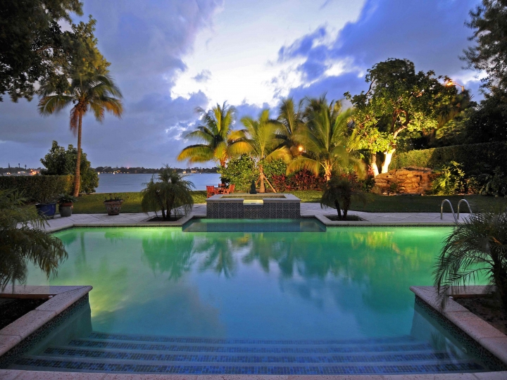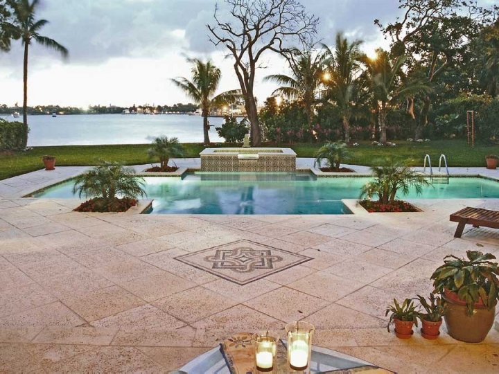 Pointing west, beautiful Intracoastal views open through the formal Living Room with architecturally detailed ceilings, oversized custom stone fireplace, and rich mahogany glass doors, which open to an inviting lanai with outdoor barbeque kitchen and a breathtakingly large oversized pool/spa area finished in Tunisian handmade tile. A smart pool/spa & garden wireless control is also available for your convenience. To enjoy a tranquil moment, you can choose one of the private gardens and just relax to the soothing sound of the water fountains. Take a walk down the tropical garden and you will reach a private dock conveniently located in a deep-water no-wake area.